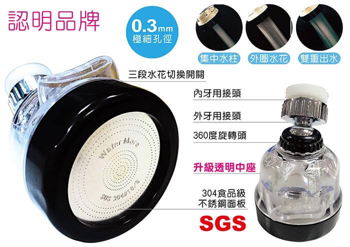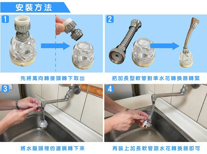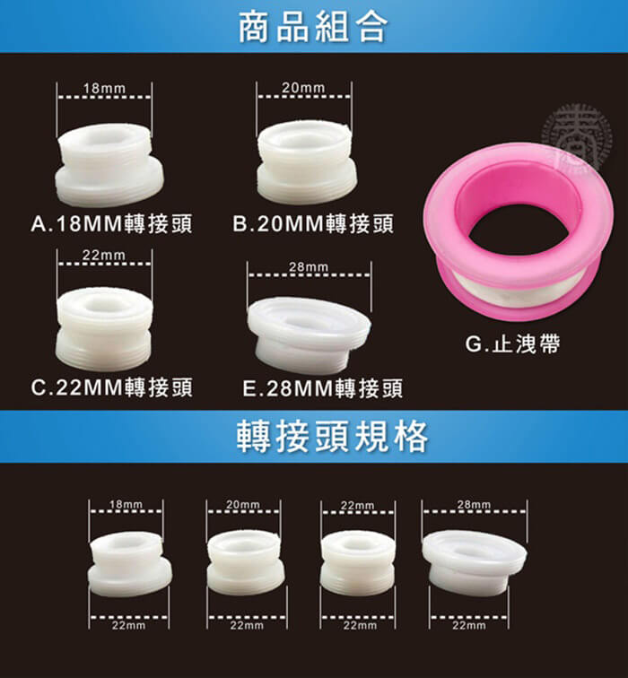 - 贈品:萬用轉換配件包(含:止洩帶x1、外牙轉換頭x4)x1、加長管(2入/包)x1包、無牙規轉接頭x1、說明書x1