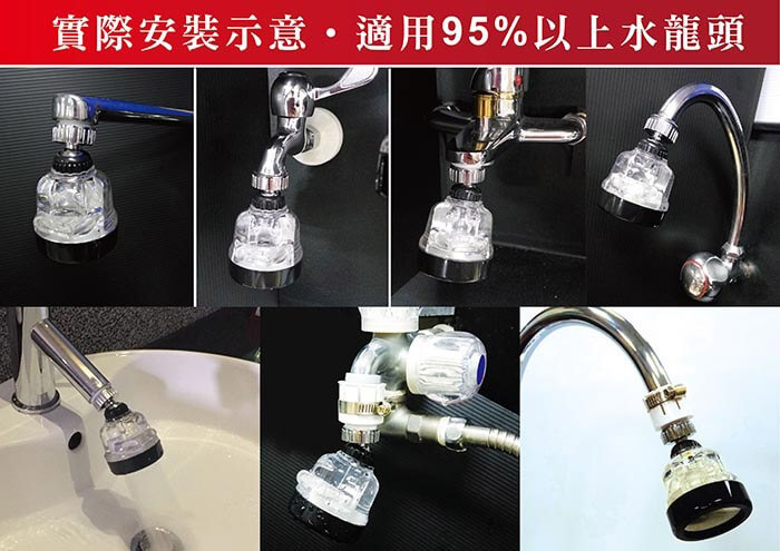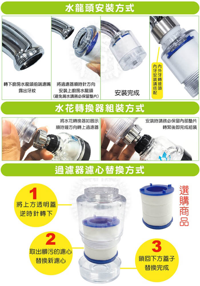 - 主商品:360度浴室廚房三段增壓噴灑頭x4、透明PP濾棉過濾器(含:濾芯x1)x4