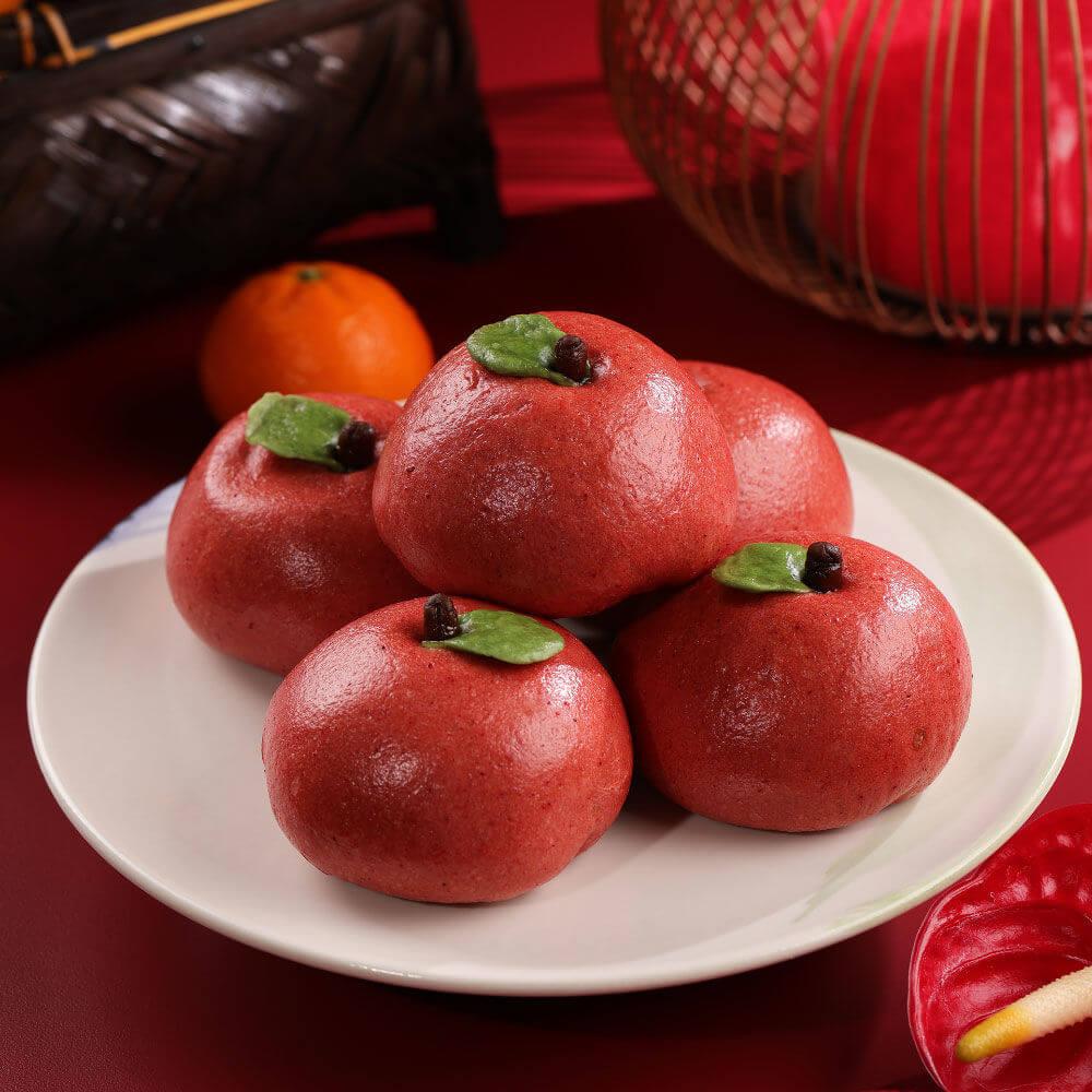 手工製作橘子造型,增添過年氣氛。麵皮採用無漂白麵粉和老麵發酵製成,口感柔韌Q彈有勁道。不含人工色素,以天然黃梔子、藍梔子、紅麴粉調和裝飾出討喜的外型。內餡則是以新鮮牛奶、椰漿、鹹鴨蛋黃等特製的奶皇餡,香濃可口。