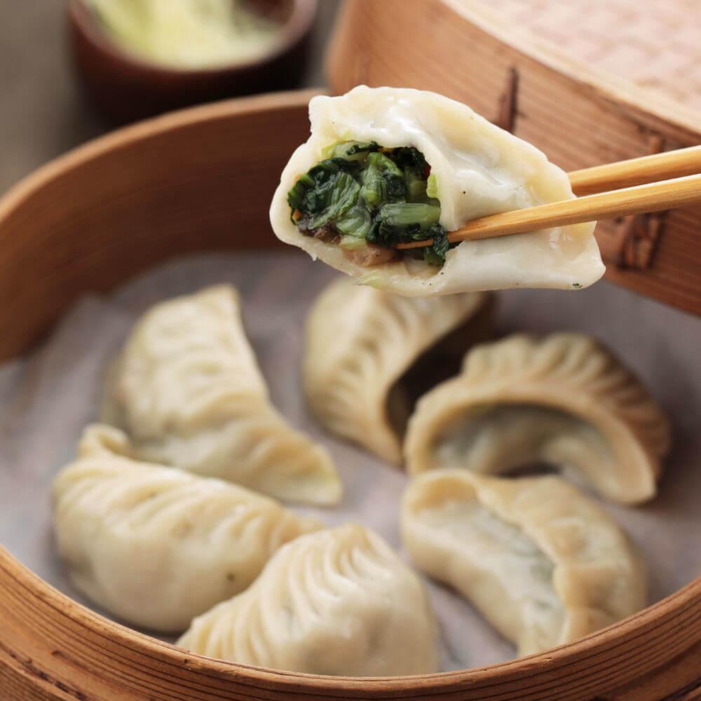 翡翠蒸餃是使用自家契種鮮採青江菜為基底。