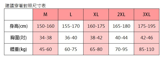 - 主商品尺寸/規格/重量:建議消費者尺寸 M:身高-150~160cm / 胸圍-34~38吋 / 體重-45~60KG L :身高-155~170cm / 胸圍-36~40吋 / 體重-60~75KG XL:身高-160~175cm / 胸圍-38~42吋 / 體重-65~80KG 2XL:身高-165~180cm / 胸圍-40~44吋 / 體重-70~95KG 3XL:身高-175~195cm / 胸圍-42~46吋 / 體重-85~110KG