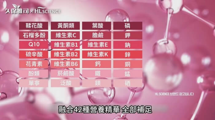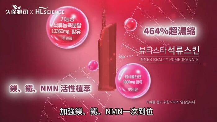 - 內容物名稱:石榴濃縮汁、菠蘿濃縮汁、魚膠原蛋白、黑醋栗汁、刺槐豆膠(刺槐豆膠、玉米糖膠、洋菜、羅望子膠、鹿角菜膠、氯化鉀)、石榴香料、檸檬酸鈉、無水檸檬酸、氯化鎂、大茴香子、焦磷酸鐵、蔗糖素(甜味劑)、彈性蛋白(魚皮)、石榴濃縮粉末、維生素C(抗氧化劑)、生物素(磷酸氫鈣、生物素)、萊姆萃取粉、花椰菜萃取粉