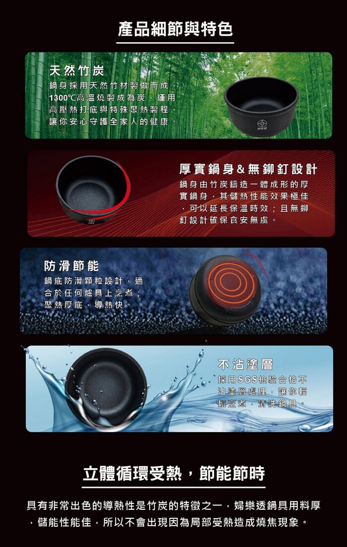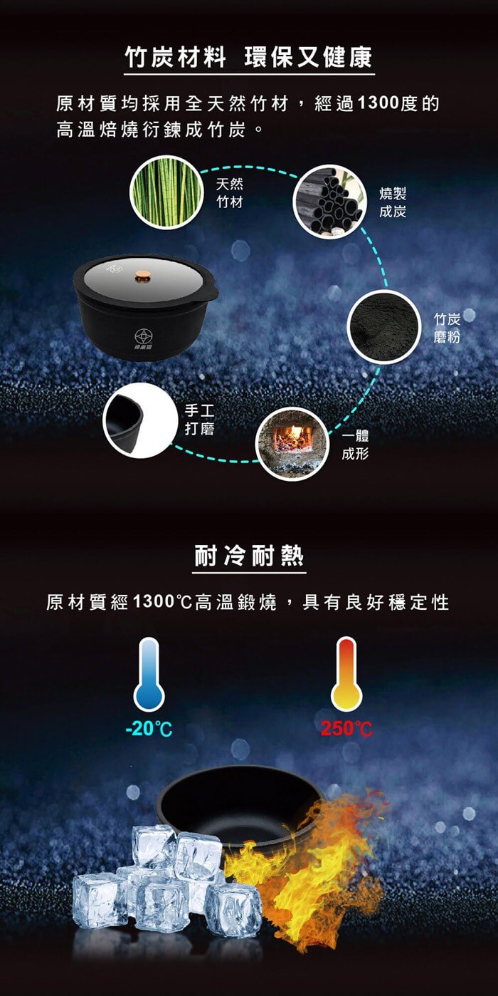 - 材質/食材:炭鍋身、強化玻璃鍋蓋、耐熱矽膠