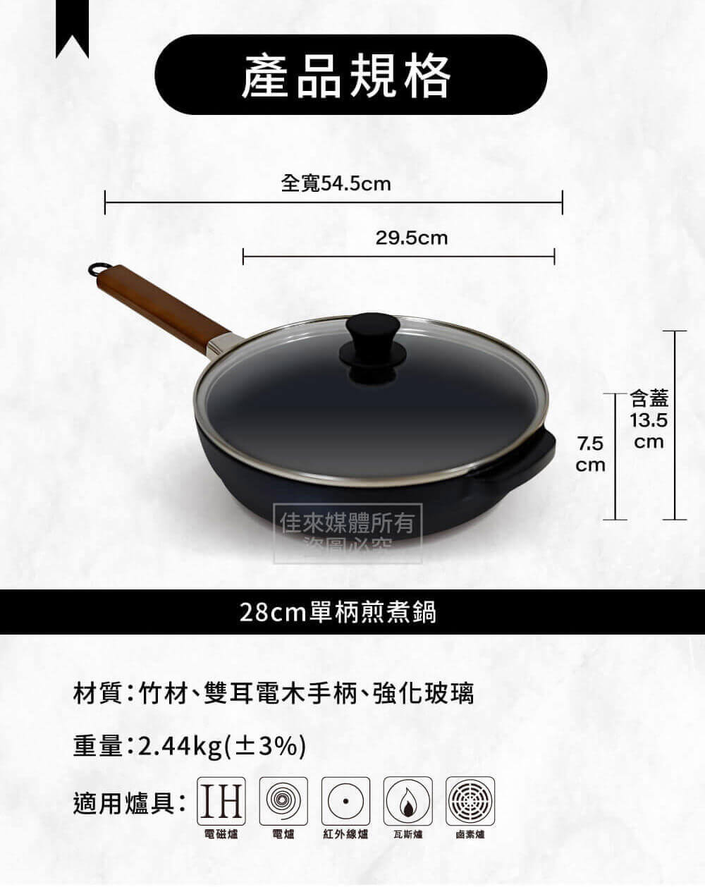 - 主商品尺寸/規格/重量/密度:尺寸:直徑28cm,全寬54.5cm(含柄)x外徑29.5x高13.5cm(含蓋),不含蓋高7.5cm 重量:2.44kg