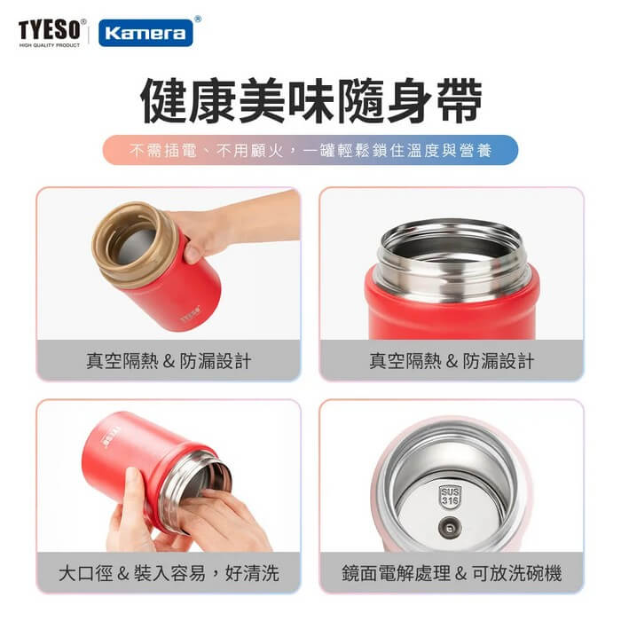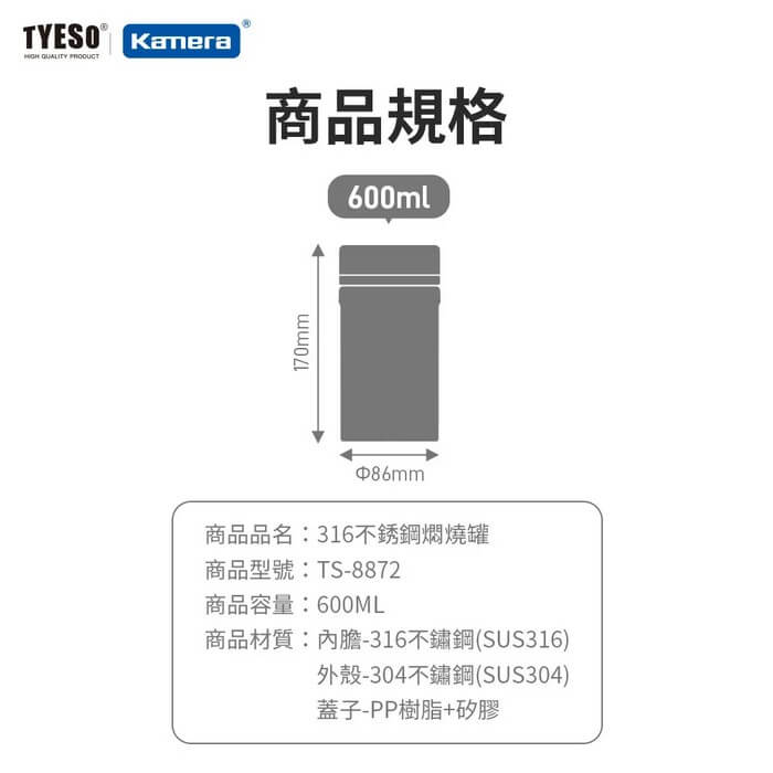 - 主商品尺寸/規格/重量/密度:商品品名:316不銹鋼燜燒罐 600ml 商品型號:TS-8872 商品材質:內膽-316不鏽鋼(SUS316) 外殼-304不鏽鋼(SUS304) 杯蓋-PP脂+矽膠 商品顏色:淡雅粉、深湖藍 商品容量:600ml 保溫效能:裝入100°C熱水後,經過6小時約≥73°C(II) 保冷效能:裝入4°C冷水後,經過6小時約≤10°C 商品尺寸:約Φ86×170mm 包裝尺寸:約175×93×95mm 商品顏色 淡雅粉 深湖藍 包裝內容:316不銹鋼燜燒罐×1、說明書×1