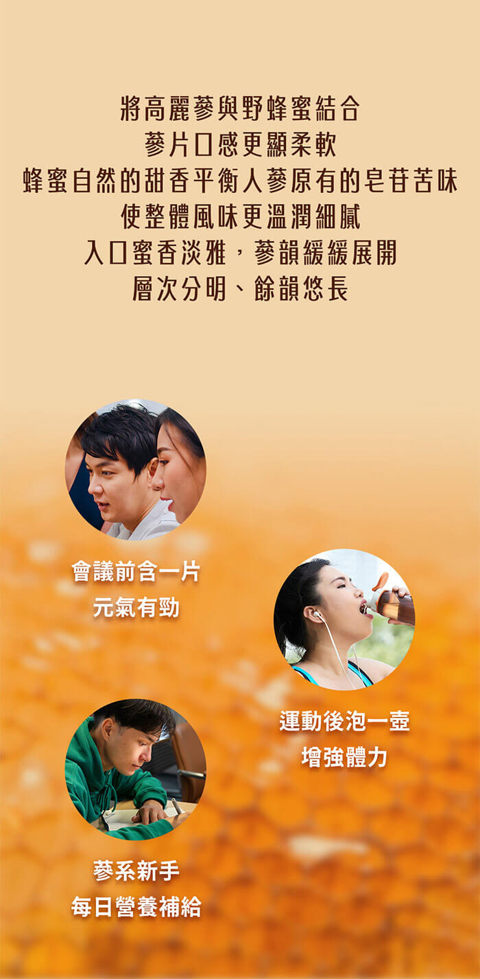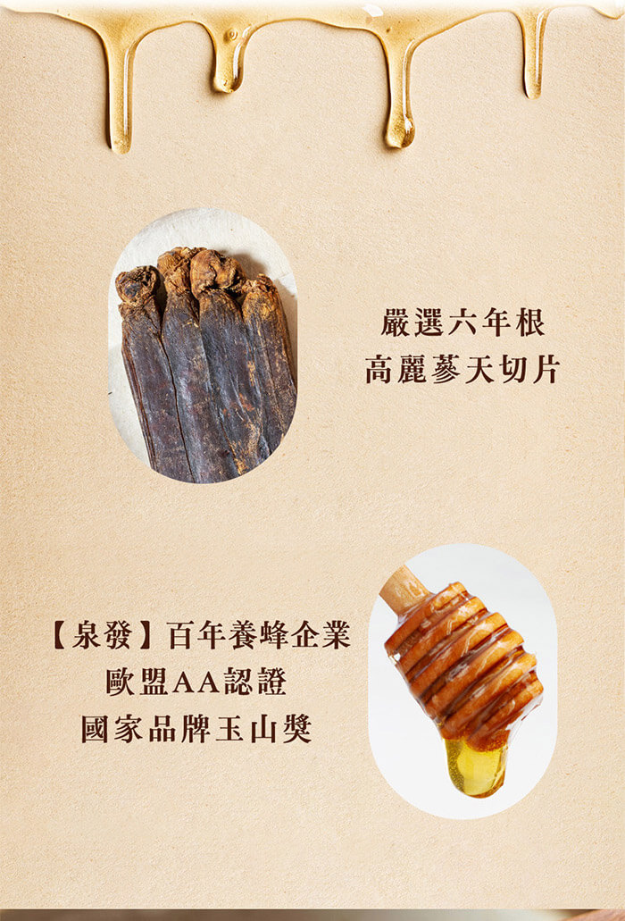 - 其他應揭露事項:本產品採用天然蜂蜜與人蔘片製成,因原料季節與批次差異,色澤與風味可能略有不同;若有少量沉澱屬自然現象,請安心使用。