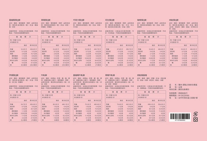 - 主商品尺寸/規格/重量:【產品規格】 品名:甜點之旅綜合禮盒 內容物:綜合牛軋餅7包、肉鬆鳳凰捲(一盒9包)、綜合雪Q餅10包 口味:越莓 / 草莓 / 花生 / 咖啡 / 芋頭 / 巧克力 / 肉鬆 規格:336g/盒 成份:詳如產品圖示 保存期限:牛軋餅-6個月/雪Q餅-6個月/肉鬆鳳凰捲-3個月 有效日期:標示於包裝上 有效日期說明:30天~90天,以消費者收受日起算,至少距有效日期前30日以上 保存方式:請置於陰涼乾燥處,避免陽光直射 產地:台灣 【注意事項】 ※過敏源提示: 此產品內含麩質的穀物、奶類、大豆、花生及芋頭其製品之過敏原,不適合其過敏體質者食用
