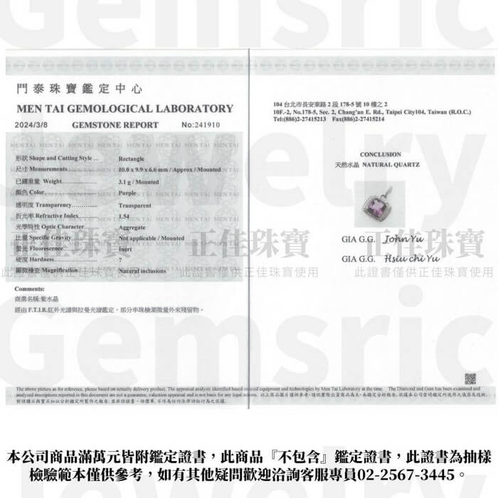 - 主商品尺寸/規格/重量:主角:紫水晶 極淨冰質 水晶吊墜|925銀方晶鋯石微鑲 銀台尺寸:16.6x16.8x7.4mm ± 0.5mm 紫水晶尺寸:9.8x9.8x6.5mm ± 0.5mm 產地:巴西 重量:3g以上 數量:1 顏色:透紫色 編號:PA063 備註:商品皆贈送相對顏色銀鍊乙條