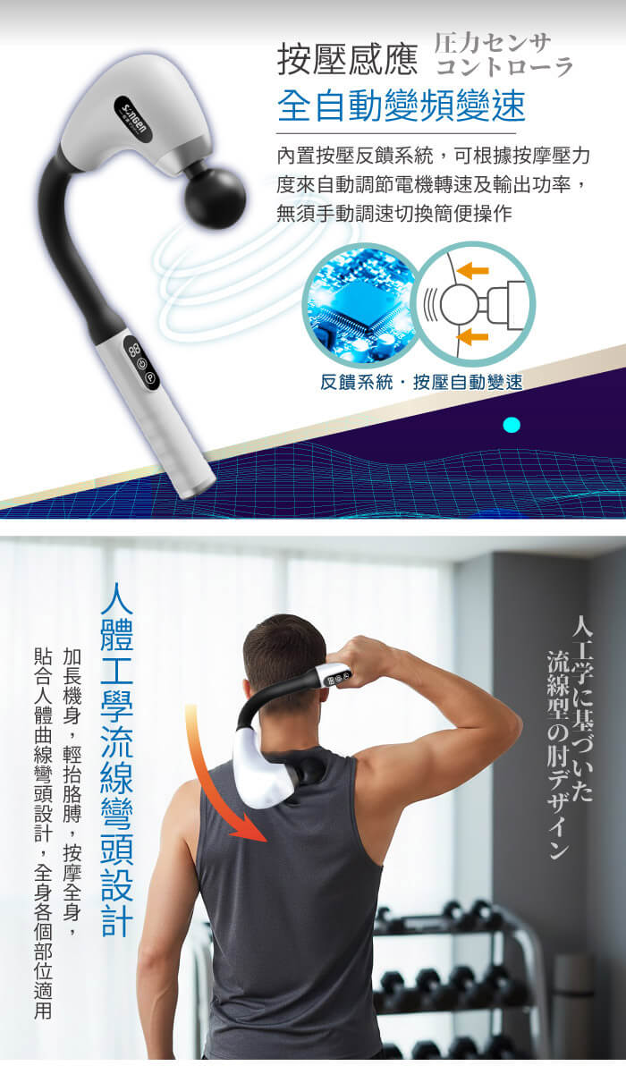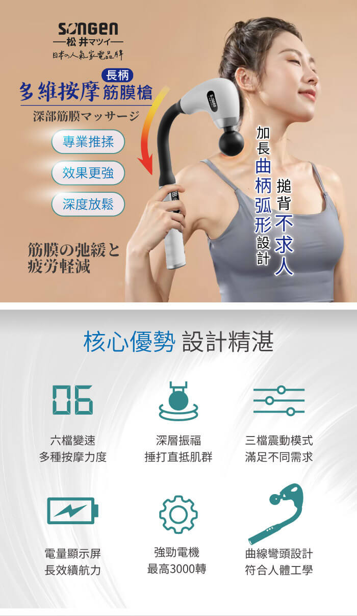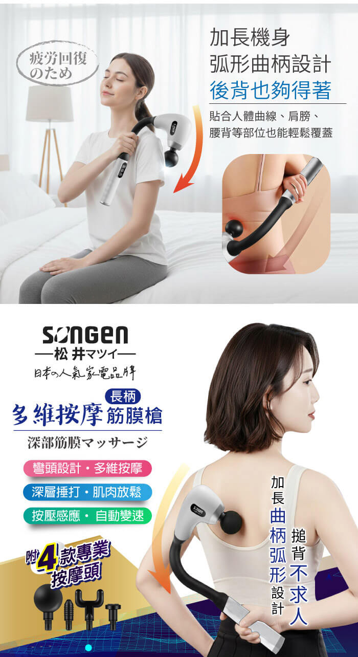 - 主商品:【SONGEN松井】多維按摩長柄弧形筋膜槍/按摩棒★附四款專業按摩頭(SG-716BX-W)