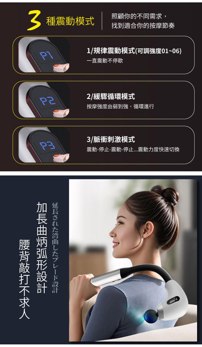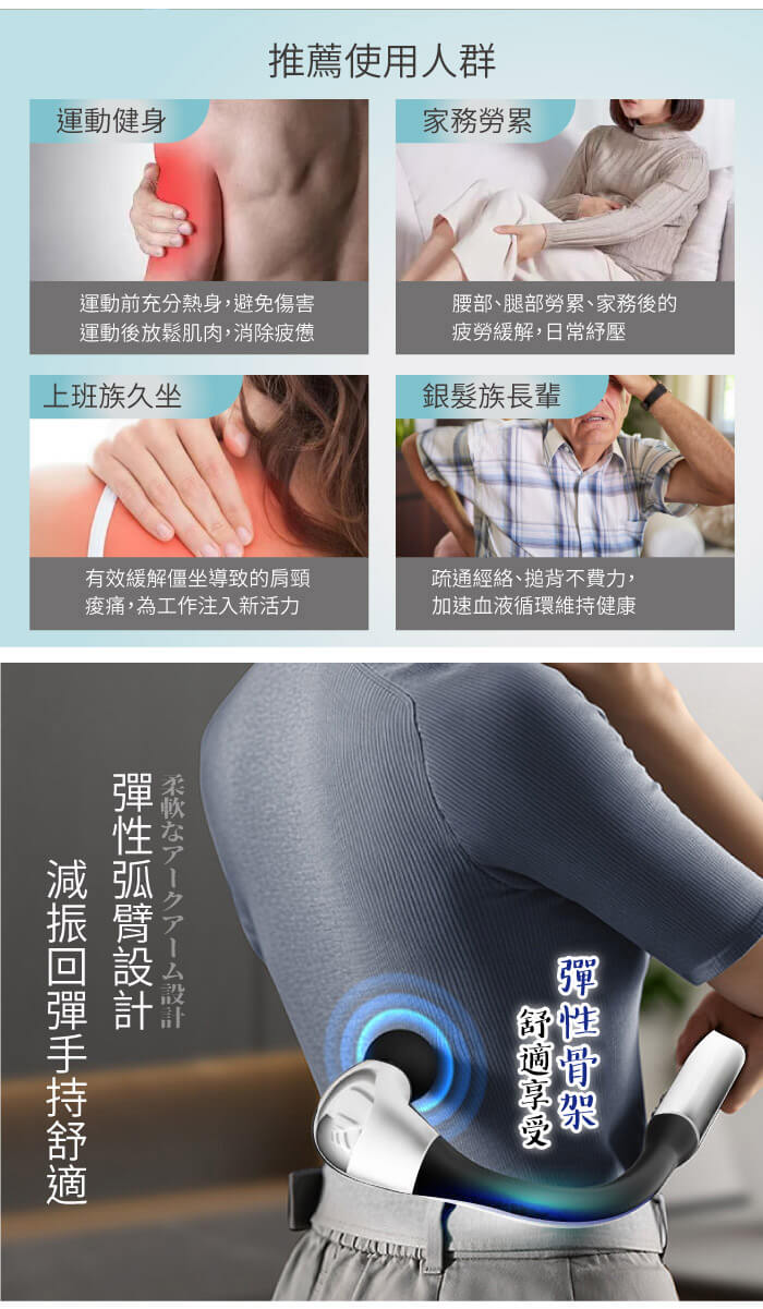 加長曲柄弧形設計,搥背不求人。
