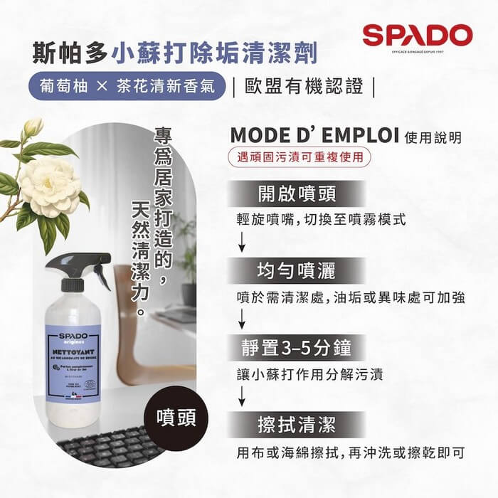 - 主商品:斯帕多|小蘇打除垢清潔劑 100%天然-葡萄柚與茶花香氣 750MX1瓶