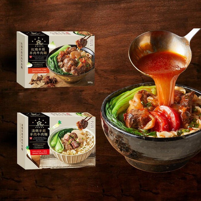 - 材質/食材:紅燒半筋半肉牛肉麵: 湯包成分: 水、牛腱肉(澳洲)、牛筋(巴拉圭)、牛油、洋蔥、豆瓣醬[辣椒、水、非基因改造黃豆、鹽、黏稠劑(乙醯化己二酸二澱粉)、麻油、調味劑(L-麩酸鈉、5'-次黃嘌呤核苷磷酸二鈉、5'-鳥嘌呤核苷磷酸二鈉)、糖、黏稠劑(玉米糖膠)、乳酸]、酸菜(芥菜、鹽)、蒜仁、味精(L-麩酸鈉、胺基乙酸、琥珀酸二鈉、岩鹽、5'-次黃嘌呤核苷磷酸二鈉、5'-鳥嘌呤核苷磷酸二鈉)、甜麵醬[水、非基因改造黃豆、糖、食鹽、大豆油、麵粉、調味劑(5'-次黃嘌呤核苷磷酸二鈉、5'-鳥嘌呤核苷磷酸二鈉)、防腐劑(己二烯酸鉀1g/kg以下)、甜味劑(甘草萃)、玉米糖膠、八角粉]、番茄糊、薑、糖(黑糖、冰糖)、米酒(米、精製食用酒精)、滷包(肉桂、小茴香、八角、花椒、孜然、山奈、丁香)、牛晶粉{鹽、L-麩酸鈉、糖、香料、麥芽糊精、玉米澱粉、牛油、水解玉米蛋白(水解玉米蛋白、麥芽糊精、鹽、葵花籽油)、牛肉風味調味料[牛肉萃取物(鹽、牛肉、麥芽糊精)、鹽、L-麩酸鈉、牛油、焦糖色素、5'-次黃嘌呤核苷磷酸二鈉、5'-鳥嘌呤核苷磷酸二鈉]、牛肉萃取物[牛肉萃取物、牛骨高湯(牛骨、鹽)、鹽、分離大豆蛋白、大豆卵磷脂]、洋蔥粉、焦糖色素、調味劑 (5'-次黃嘌呤核苷磷酸二鈉、5'-鳥嘌呤核苷磷酸二鈉)、二氧化矽、大蒜粉、檸檬酸、黑胡椒粉}、著色劑[焦糖色素(普通焦糖)]、蒜碎。 麵體成分:小麥麵粉、水、鹽。 清燉半筋半肉牛肉麵: 水、牛腱(澳洲)、牛筋(巴拉圭)、白蘿蔔、米酒、鹽、牛油、蔥、薑、牛晶粉{鹽、L-麩酸鈉、麥芽糊精、香料、糖、玉米澱粉、牛油(牛油、氫化棕櫚油)、牛肉粉(牛肉、鹽、多磷酸鈉、香辛料(肉桂、大茴香、小豆蔻、草豆蔻)、複合調味劑乳糖、DL-胺基丙酸、呈味核苷酸二鈉(5'-次黃嘌呤核苷磷酸二鈉、5'-鳥嘌呤核苷磷酸二鈉)、胺基乙酸、琥珀酸二鈉、檸檬酸鈉、糖、抗氧化劑(維生素 E)}、酵母萃取物(酵母萃取物、鹽)、洋蔥粉、調味劑(5'-次黃嘌呤核苷磷酸二鈉、5'-鳥嘌呤核苷磷酸二鈉、檸檬酸)、焦糖色素、白胡椒}、冰糖、味鮮(L-麩酸鈉、胺基乙酸、琥珀酸二鈉、岩鹽、5'-次黃嘌呤核苷磷酸二鈉、5'-鳥嘌呤核苷磷酸二鈉)、陳皮。 麵體:小麥麵粉、水、鹽。