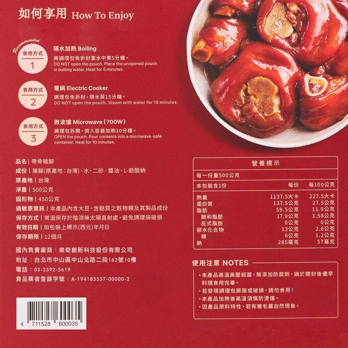 • 材質/食材:豬腳(原產地:台灣)、水、二砂、醬油、L-麩酸鈉。