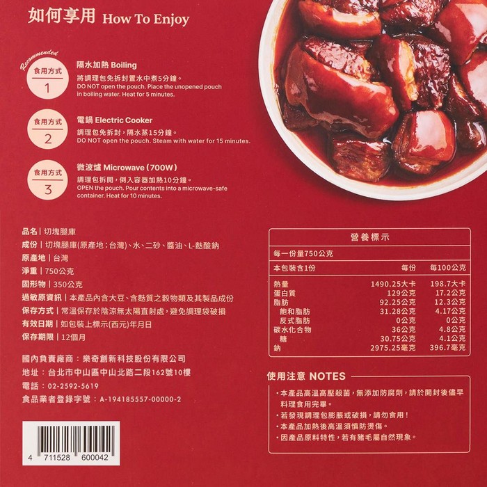 • 主商品尺寸/規格/重量:品名:【五燈獎】豬腳組合套組(豬腳X1,腿庫X1) 內容物名稱:下列各一盒: 【五燈獎】帶骨豬腳-500g(固形物450g) 【五燈獎】切塊腿庫-750g(固形物350g) 內容量:帶骨豬腳500g(固形物 450g)/包+切塊腿庫750g(固形物 400g)/包 原產地:台灣 保存期限:常溫 12個月 製造廠商或國內負責廠商名稱: 樂奇創新科技股份有限公司 製造廠商或國內負責廠商電話:02-2592-5619 製造廠商或國內負責廠商地址: 104027 台北市中山區中山北路二段162號10樓 投保產品責任險字號:明台產物保險:0803-14PDT00874號 食品業者登錄字號:A-194185557-00000-2