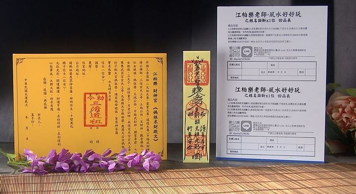 - 贈品:黃財神琉璃浮雕項鍊(含PVC袋)x1、平安符x1、媽祖疏文x1、姓名論斷回函表(2位)x1