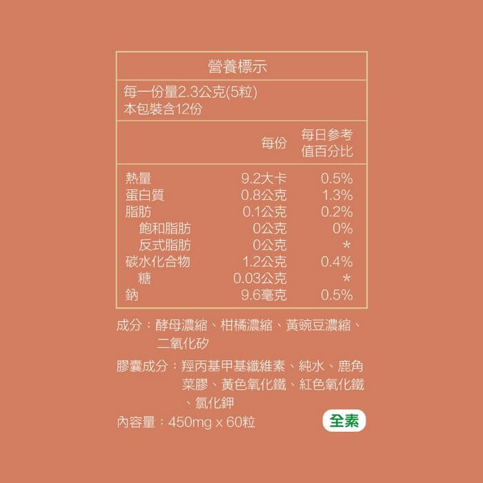 - 材質/食材:主要成份:酵母濃縮、柑橘濃縮、黃豌豆濃縮、二氧化矽