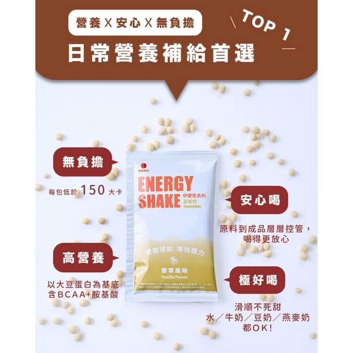 - 主商品:ENERGY SHAKE伊愛思系列-亞米代yummy-diet香草風味營養能量飲(15包/盒)*1