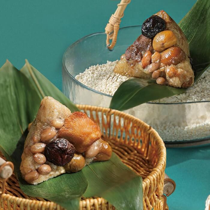 - 材質/食材:經典香菇栗子粽: 糯米、花生、栗子、香菇、素肉塊(大豆蛋白、大豆植物油、糖、L-麩酸鈉、鹽、白胡椒、八角、油桂、三奈、月桂葉)、大豆沙拉油、無添加原味醬油(水、非基因改造脫脂黃豆)、麻油薑、蔗糖、鹽、黑胡椒、五香粉(小茴香、肉桂、八角、胡荽、丁香)。 麻油薑猴頭菇香菇栗子粽: 糯米、花生、栗子、香菇、猴頭菇粒[猴頭菇、大豆分離蛋白、樹薯澱粉、大豆油、調味劑(糖、碘鹽、琥珀酸二鈉、5'-次黃嘌呤核苷磷酸二鈉、5'-鳥嘌呤核苷磷酸二鈉、L-麩酸鈉、檸檬酸鈉、氨基乙酸]、大豆沙拉油、無添加原味醬油(水、非基因改造脫脂黃豆)、麻油薑[薑、葵花油、純黑麻油、植物性調味料 (海鹽、醬油粉(純釀醬油、麥芽糊精)、歐芹粉、百里香粉、香草粉、大豆發酵萃取物)、碘鹽、維生素E(抗氧化劑)]、蔗糖、鹽、黑胡椒、五香粉(小茴香、肉桂、八角、胡荽、丁香)。