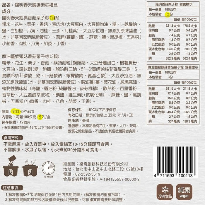 - 主商品尺寸/規格/重量:品名:【陽明春天】嚴選素粽禮盒(5入)x3盒 內容物名稱:【陽明春天】嚴選素粽禮盒(5入)x3盒 內容量:900g(經典香菇栗子粽180g*2顆+麻油薑猴頭菇香菇栗子粽180g*3顆)/盒 x3盒 原產地:台灣 保存期限:冷凍 12個月 製造廠商或國內負責廠商名稱: 樂奇創新科技股份有限公司 製造廠商或國內負責廠商電話:02-2592-5619 製造廠商或國內負責廠商地址: 104027 台北市中山區中山北路二段162號10樓 投保產品責任險字號:明台產物保險:0803-14PDT00874號 食品業者登錄字號:A-194185557-00000-2
