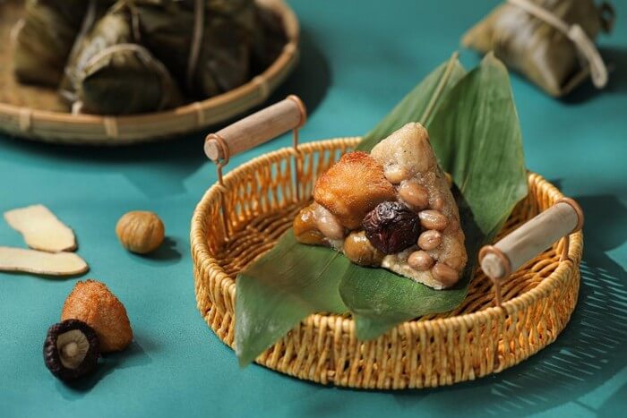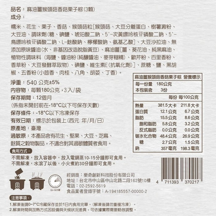 - 材質/食材:糯米、花生、栗子、香菇、猴頭菇粒[猴頭菇、大豆分離蛋白、樹薯澱粉、大豆油、調味劑(糖、碘鹽、琥珀酸二鈉、5'-次黃嘌呤核苷磷酸二鈉、5'-鳥嘌呤核苷磷酸二鈉、L-麩酸鈉、檸檬酸鈉、氨基乙酸]、大豆沙拉油、無添加原味醬油(水、非基因改造脫脂黃豆)、麻油薑[薑、葵花油、純黑麻油、植物性調味料 (海鹽、醬油粉(純釀醬油、麥芽糊精)、歐芹粉、百里香粉、香草粉、大豆發酵萃取物)、碘鹽、維生素E(抗氧化劑)]、蔗糖、鹽、黑胡椒、五香粉(小茴香、肉桂、八角、胡荽、丁香)。