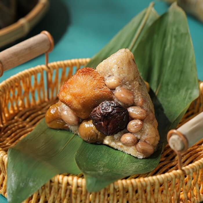 - 材質/食材:糯米、花生、栗子、香菇、猴頭菇粒[猴頭菇、大豆分離蛋白、樹薯澱粉、大豆油、調味劑(糖、碘鹽、琥珀酸二鈉、5'-次黃嘌呤核苷磷酸二鈉、5'-鳥嘌呤核苷磷酸二鈉、L-麩酸鈉、檸檬酸鈉、氨基乙酸]、大豆沙拉油、無添加原味醬油(水、非基因改造脫脂黃豆)、麻油薑[薑、葵花油、純黑麻油、植物性調味料 (海鹽、醬油粉(純釀醬油、麥芽糊精)、歐芹粉、百里香粉、香草粉、大豆發酵萃取物)、碘鹽、維生素E(抗氧化劑)]、蔗糖、鹽、黑胡椒、五香粉(小茴香、肉桂、八角、胡荽、丁香)。