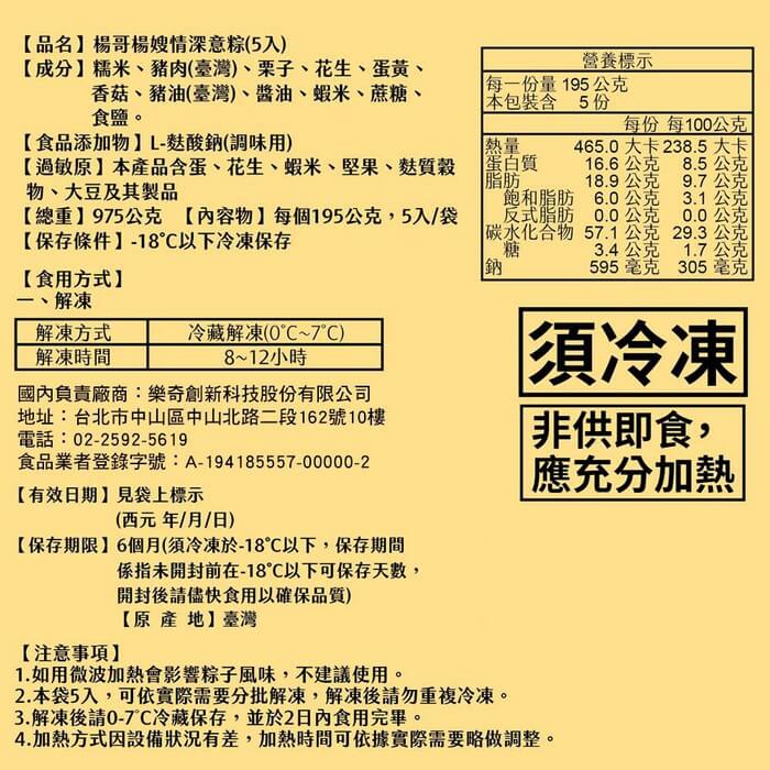 - 主商品尺寸/規格/重量:品名:【楊哥楊嫂】情深意粽(5入)x2袋 內容物名稱:【楊哥楊嫂】情深意粽(5入)x2袋 內容量:975g(195g*5顆)/袋 x2袋 原產地:台灣 保存期限:冷凍 6個月 製造廠商或國內負責廠商名稱: 樂奇創新科技股份有限公司 製造廠商或國內負責廠商電話:02-2592-5619 製造廠商或國內負責廠商地址: 104027 台北市中山區中山北路二段162號10樓 投保產品責任險字號:明台產物保險:0803-14PDT00874號 食品業者登錄字號:A-194185557-00000-2