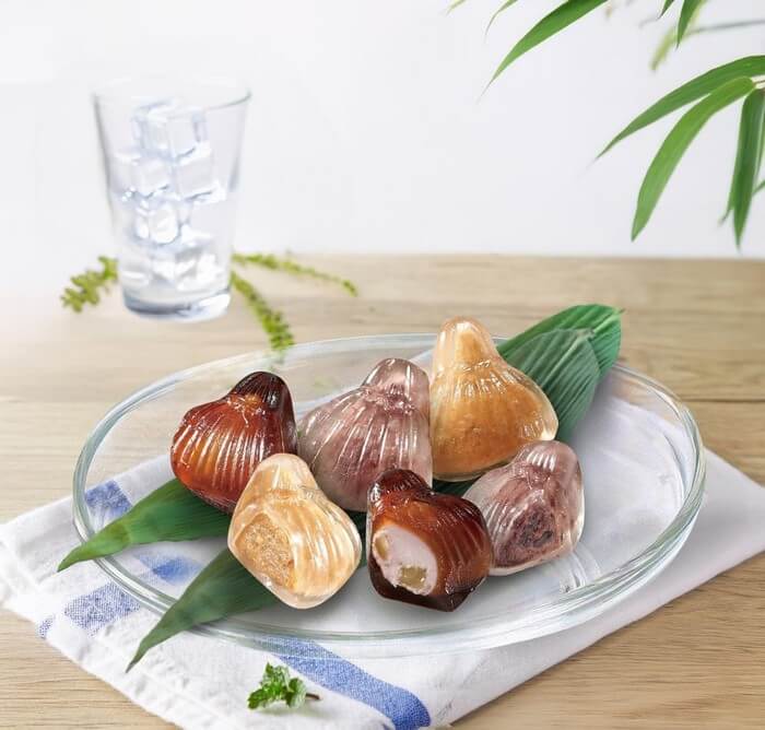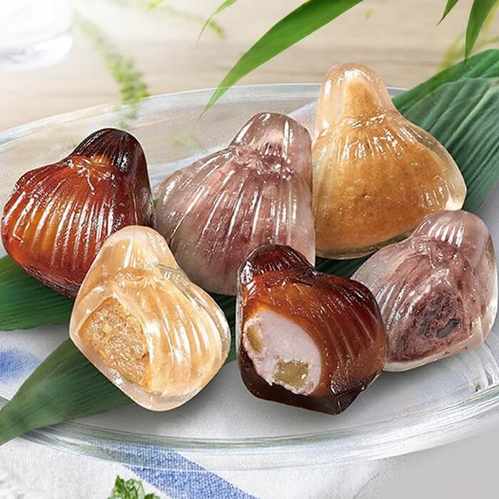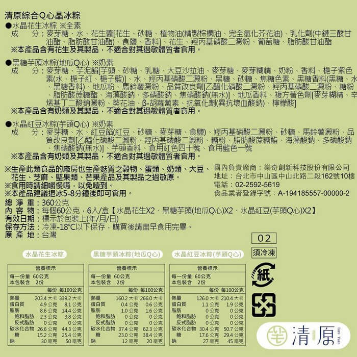 - 材質/食材:水晶花生冰粽:麥芽糖、水、花生醬[花生、砂糖、植物油(精製棕櫚油、完全氫化芥花油)、乳化劑(中鏈三酸甘油酯、脂肪酸甘油酯)、食鹽、香料]、花生、羥丙基磷酸二澱粉、葡萄糖、脂肪酸甘油酯。 黑糖芋頭冰粽(地瓜Q心):麥芽糖、芋泥餡[芋頭、砂糖、乳糖、大豆沙拉油、麥芽糖、麥芽糊精、奶粉、香料、梔子紫色素(水、梔子紅、梔子藍)]、水、羥丙基磷酸二澱粉、黑糖、砂糖、焦糖色素、黑糖香料(黑糖、水、黑糖香料)、地瓜粉、馬鈴薯澱粉、品質改良劑[乙醯化磷酸二澱粉、羥丙基磷酸二澱粉、糖粉、脂肪酸蔗糖酯、海藻酸鈉、多磷酸鈉、焦磷酸鈉(無水)]、地瓜香料、複方著色劑[麥芽糊精、辛烯基丁二酸鈉澱粉、葵花油、β-胡蘿蔔素、抗氧化劑(異抗壞血酸鈉)、檸檬酸]。 水晶紅豆冰粽(芋頭Q心):麥芽糖、水、紅豆餡(紅豆、砂糖、麥芽糖、食鹽)、羥丙基磷酸二澱粉、砂糖、馬鈴薯澱粉、品質改良劑[乙醯化磷酸二澱粉、羥丙基磷酸二澱粉、糖粉、脂肪酸蔗糖酯、海藻酸鈉、多磷酸鈉、焦磷酸鈉(無水)]、芋頭香料、食用紅色四十號、食用藍色一號。