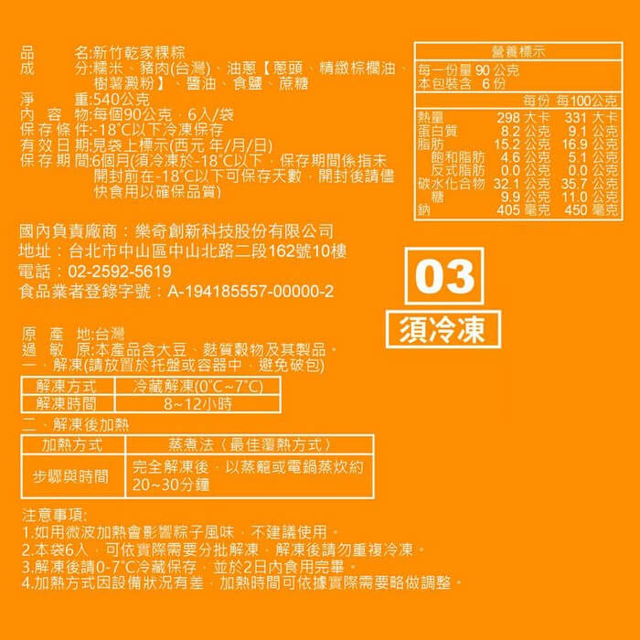 - 主商品尺寸/規格/重量:品名:【乾家肉粽大王】新竹乾家粿粽(6入)x2袋 內容物名稱:【乾家肉粽大王】新竹乾家粿粽(6入)x2袋 內容量:540g(粿粽90g*6顆)/袋 x2袋 原產地:台灣 保存期限:冷凍 6個月 製造廠商或國內負責廠商名稱: 樂奇創新科技股份有限公司 製造廠商或國內負責廠商電話:02-2592-5619 製造廠商或國內負責廠商地址: 104027 台北市中山區中山北路二段162號10樓 投保產品責任險字號:明台產物保險:0803-14PDT00874號 食品業者登錄字號:A-194185557-00000-2
