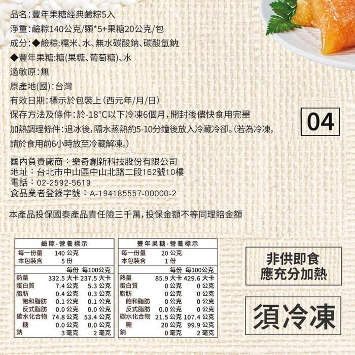 - 主商品尺寸/規格/重量:品名:【豐年果糖】經典鹼粽(5入)x3袋 內容物名稱:【豐年果糖】經典鹼粽(5入)x3袋 內容量:720g(鹼粽140g*5顆+果糖20g*1包)/袋 x3袋 原產地:台灣 保存期限:冷凍 6個月 製造廠商或國內負責廠商名稱: 樂奇創新科技股份有限公司 製造廠商或國內負責廠商電話:02-2592-5619 製造廠商或國內負責廠商地址: 104027 台北市中山區中山北路二段162號10樓 投保產品責任險字號:明台產物保險:0803-14PDT00874號 食品業者登錄字號:A-194185557-00000-2