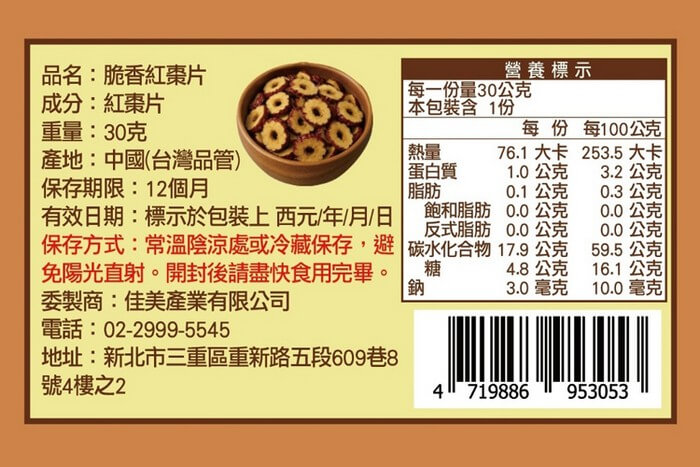 - 主商品尺寸/規格/重量:品名 : 脆香紅棗片 成份:紅棗 規格:30g/包 保存期限:12個月 有效日期:標示於包裝上(西元 年/月/日) 有效日期說明:120天~365天,以消費者收受日起算,至少距有效日期前120日以上 保存方式:常溫陰涼處或冷藏保存,避免陽光直射。開封後請冷藏保存並盡快食用完畢 產地:中國(台灣品管) 國際條碼 : 4719886953053