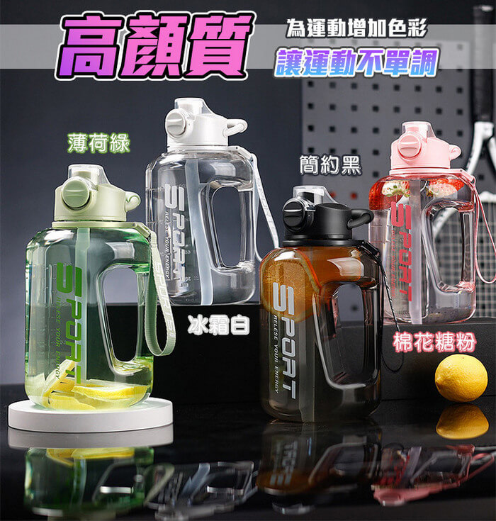 - 主商品尺寸/規格/重量/密度:品名 : 大容量水壺噸噸桶吸管水壺-A/贈水壺刷 容量:1700ml 顏色:棉花糖粉、薄荷綠、簡約黑、冰霜白 材質:PC材質 商品重量:總重230g 產地 : 中國