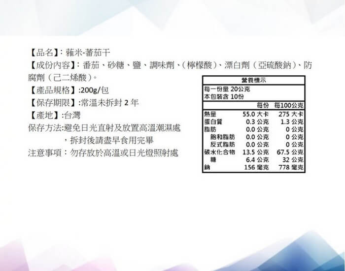 - 主商品尺寸/規格/重量:【產品規格】 品名: 蕃茄干 規格: 200g/包 成份: 蕃茄、砂糖、鹽、調味劑(檸檬酸)、漂白劑(亞硫酸鈉)、防腐劑(己二烯酸) 食品添加物: 調味劑(檸檬酸)、漂白劑(亞硫酸鈉)、防腐劑(己二烯酸) 保存方式:避免日光直射及放置高溫潮濕處,拆封後請盡早食用完畢 保存期限:2年(未拆封) 有效日期:標示於包裝上 有效日期說明:240天~730天,以消費者收受日起算,至少距有效日期前240日以上 產地:台灣 【注意事項】 過敏原訊息:本產品含有偏亞硫酸鈉類,不適合對其過敏體質者食用