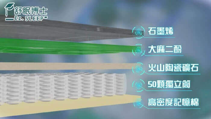 - 材質/食材:表布:100%聚酯纖維(內含石墨烯+CBD膠囊) 裏布:100%聚酯纖維 填充物:50顆獨立筒/聚氨酯/陶瓷顆粒遠紅外線