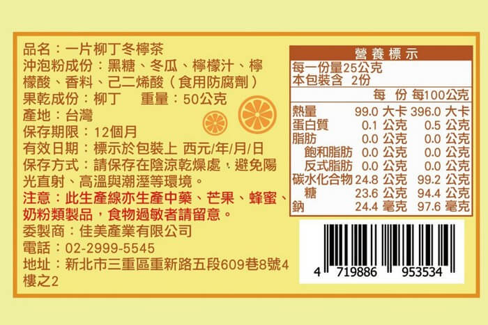 - 主商品尺寸/規格/重量:【產品規格】 品名 : 一片柳丁冬檸茶 成份 : ※沖泡粉成份:黑糖、冬瓜、檸檬汁、檸檬酸、香料、己二烯酸(食用防腐劑) ※果乾成份:柳丁 食品添加物 : 香料、己二烯酸(食用防腐劑) 產地:台灣 重量:50公克 保存方式:請保存在陰涼乾燥處,避免陽光直射、高溫與潮溼等環境 保存期限:12個月 有效日期:標示於包裝上 有效日期說明:120天~365天,以消費者收受日起算,至少距有效日期前120日以上 國際條碼: 4719886953534 【飲用方式】 ※熱飲-暖心順口、果香更濃 將 1 包茶粉倒入杯中,加入 300 ml 熱水,放入柳丁果乾片,攪拌即可飲用。 ※冷飲-清爽酸甜、解膩好喝 1包茶粉先用少量溫水化開,再加入 300 ml 冷水或冰水,放入柳丁果乾片與冰塊即可。 ※風味加分-可搭配氣泡水,風味更佳。 貼心小提醒-甜度可依喜好調整水量,柳丁果片可浸泡後食用 【過敏原訊息】 此生產線亦生產中藥、芒果、蜂蜜、奶粉類製品,食物過敏者請留意
