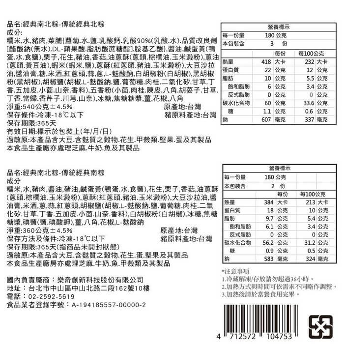 - 材質/食材:傳統經典北粽成份:糯米,水,豬肉,菜脯{蘿蔔.水.鹽. 乳酸鈣.乳酸90%(乳酸.水).品質改良劑[醋酸鈉(無水).D-蘋果酸.脂肪酸蔗糖酯].胺基乙酸},醬油,鹹蛋黃(鴨蛋.水.食鹽),栗子,花生,豬油,香菇,油蔥酥(蔥頭.棕櫚油.玉米澱粉),蔥油(蔥頭.黃豆油),蝦米(蝦米.鹽),蔥酥(紅蔥頭.豬油.玉米澱粉),大豆沙拉油,醬油膏,糖,米酒,紅蔥頭,蒜,蔥,L-麩酸鈉,白胡椒粉(白胡椒),黑胡椒粉(黑胡椒),胡椒鹽(胡椒.L-麩酸鈉,鹽.葡萄糖.肉桂.二氧化矽.甘草.丁香.五加皮.小茴.山奈.香料),五香粉(小茴.肉桂.陳皮.八角.胡荽子.甘草.丁香.當歸.香芹子.川芎.山奈),冰糖,焦糖糖漿,薑,花椒,八角。 傅統經典南粽成份:糯米,水,豬肉,醬油,豬油,鹹蛋黃(鴨蛋.水.食鹽),花生,栗子,香菇,油蔥酥(蔥頭.棕櫚油,玉米澱粉),蔥酥(紅蔥頭.豬油.玉米澱粉),大豆沙拉油,醬油膏,米酒,蔥,蒜,紅蔥頭,胡椒鹽(胡椒.L-麩酸鈉.鹽.葡萄糖.肉桂.二氧化矽.甘草.丁香.五加皮.小茴. 山奈.香料),白胡椒粉(白胡椒),冰糖,焦糖糖漿,碘鹽(鹽.碘酸鉀),薑,八角,花椒,L-麩酸鈉。