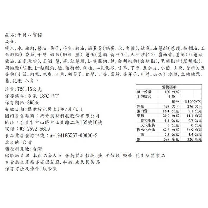 - 主商品尺寸/規格/重量:品名:【台北晶華酒店】干貝八寶粽禮盒(4入)x3盒 內容物名稱:【台北晶華酒店】干貝八寶粽禮盒(4入)x3盒 內容量:720g(干貝八寶粽180g*4顆)/盒 x3盒 原產地:台灣 保存期限:冷凍 12個月 製造廠商或國內負責廠商名稱: 樂奇創新科技股份有限公司 製造廠商或國內負責廠商電話:02-2592-5619 製造廠商或國內負責廠商地址: 104027 台北市中山區中山北路二段162號10樓 投保產品責任險字號:明台產物保險:0803-14PDT00874號 食品業者登錄字號:A-194185557-00000-2