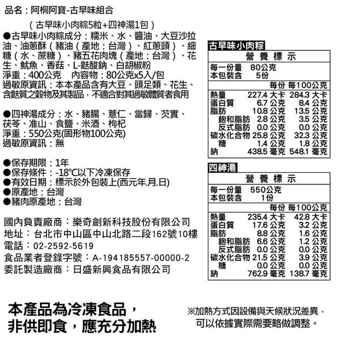- 主商品尺寸/規格/重量:品名:【阿桐阿寶】古早味組合(古早味小肉粽5入+四神湯)x3組 內容物名稱:【阿桐阿寶】古早味組合(古早味小肉粽5入+四神湯)x3組 內容量:400g(古早味小肉粽80g*5粒)/袋+四神湯550g(固形物100g)*1包 x3組 原產地:台灣 保存期限:冷凍 12個月 製造廠商或國內負責廠商名稱: 樂奇創新科技股份有限公司 製造廠商或國內負責廠商電話:02-2592-5619 製造廠商或國內負責廠商地址: 104027 台北市中山區中山北路二段162號10樓 投保產品責任險字號:明台產物保險:0803-14PDT00874號 食品業者登錄字號:A-194185557-00000-2