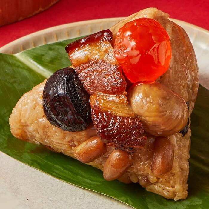 - 材質/食材:糯米、豬五花肉(產地:台灣)、蛋黃、香菇、栗子、花生、紅蔥頭、醬油(水、脫脂黃豆片(原料來源非基因改造黃豆)、小麥、食鹽、液糖(蔗糖、水)、酒精、酵母抽出物、甜味劑(甘草萃(甘草萃(甜味劑)、糊精、檸檬酸))、紅麹色素(紅麹色素、酒精)、調味劑(DL-蘋果酸)、大豆沙拉油、蔗糖、豬油(產地:台灣)、香油(芝麻油、大豆沙拉油)、油蔥酥(紅蔥頭、棕櫚油)、米酒、鹽、雞粉(鹽、麥芽糊精、L-麩酸鈉、糖、玉米澱粉、雞肉粉(雞肉、迷迭香萃取物(抗氧化劑))、香料、酵母萃取物(酵母萃取物、鹽)、雞油(雞油、迷迭香萃取物(抗氧化劑))、棕櫚油、調味劑(5-鳥嘌呤核苷磷酸二鈉、5-次黃嘌呤核苷磷酸二鈉)、白胡椒)、黑胡椒、肉桂粉、五香粉(肉桂、八角、丁香、小茴香、花椒)、紹興酒。