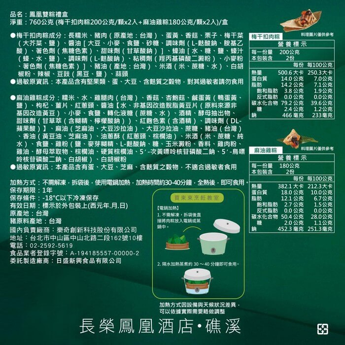 - 主商品尺寸/規格/重量:品名:【長榮鳳凰酒店.礁溪】鳳凰雙粽禮盒(4入)x2盒 內容物名稱:【長榮鳳凰酒店.礁溪】鳳凰雙粽禮盒(4入)x2盒 內容量:760g(梅干扣肉粽200g*2顆+麻油雞肉粽180gx2顆)/盒 x2盒 原產地:台灣 保存期限:冷凍 12個月 製造廠商或國內負責廠商名稱: 樂奇創新科技股份有限公司 製造廠商或國內負責廠商電話:02-2592-5619 製造廠商或國內負責廠商地址: 104027 台北市中山區中山北路二段162號10樓 投保產品責任險字號:明台產物保險:0803-14PDT00874號 食品業者登錄字號:A-194185557-00000-2