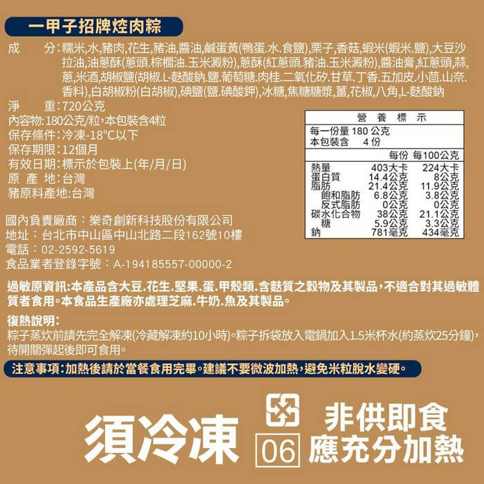 - 主商品尺寸/規格/重量:品名:【一甲子】招牌焢肉粽(4入)x2袋 內容物名稱:【一甲子】招牌焢肉粽(4入)x2袋 內容量:720g(招牌焢肉粽180g*4顆)/袋 x2袋 原產地:台灣 保存期限:冷凍 12個月 製造廠商或國內負責廠商名稱: 樂奇創新科技股份有限公司 製造廠商或國內負責廠商電話:02-2592-5619 製造廠商或國內負責廠商地址: 104027 台北市中山區中山北路二段162號10樓 投保產品責任險字號:明台產物保險:0803-14PDT00874號 食品業者登錄字號:A-194185557-00000-2