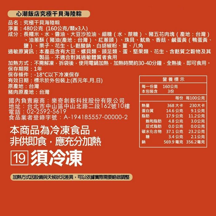 - 主商品尺寸/規格/重量:品名:【心潮飯店】究極干貝海陸粽(3入)x2袋 內容物名稱:【心潮飯店】究極干貝海陸粽(3入)x2袋 內容量:480g(干貝海陸粽160g*3顆)/袋 x2袋 原產地:台灣 保存期限:冷凍 12個月 製造廠商或國內負責廠商名稱: 樂奇創新科技股份有限公司 製造廠商或國內負責廠商電話:02-2592-5619 製造廠商或國內負責廠商地址: 104027 台北市中山區中山北路二段162號10樓 投保產品責任險字號:明台產物保險:0803-14PDT00874號 食品業者登錄字號:A-194185557-00000-2