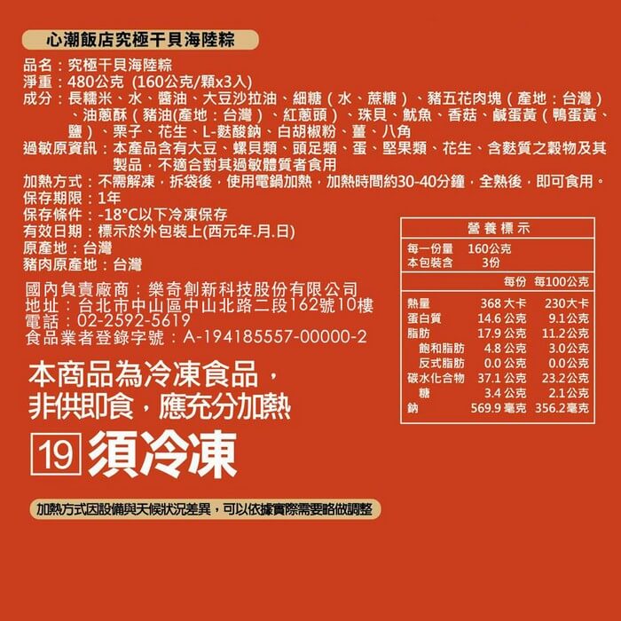 - 主商品尺寸/規格/重量:品名:【心潮飯店】究極干貝海陸粽(3入)x3袋 內容物名稱:【心潮飯店】究極干貝海陸粽(3入)x3袋 內容量:480g(干貝海陸粽160g*3顆)/袋 x3袋 原產地:台灣 保存期限:冷凍 12個月 製造廠商或國內負責廠商名稱: 樂奇創新科技股份有限公司 製造廠商或國內負責廠商電話:02-2592-5619 製造廠商或國內負責廠商地址: 104027 台北市中山區中山北路二段162號10樓 投保產品責任險字號:明台產物保險:0803-14PDT00874號 食品業者登錄字號:A-194185557-00000-2