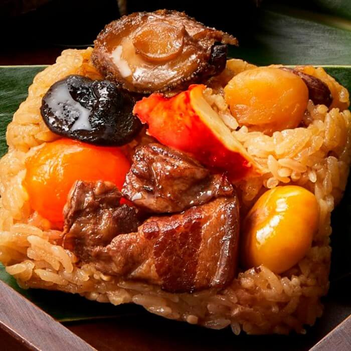 - 材質/食材:糯米、豬五花肉(原產地:台灣)、龍蝦肉(產地:巴西)、鮑魚、鹹蛋黃(鴨蛋黃、鹽)、花菇、栗子、干貝、豬高湯(豬骨(產地:台灣)、水)、豬油(產地:台灣)、蝦米、油蔥酥(蔥頭、棕櫚油、玉米澱粉)、黑胡椒粒、糖、L-麩酸鈉、雞粉(鹽、麥芽糊精、L-麩酸鈉、糖、玉米澱粉、香料、雞肉粉、雞油、酵母萃取物、棕櫚油、硬質棕櫚油、5'-次黃嘌呤核苷磷酸二鈉、5'-烏嘌呤核苷磷酸二鈉、白胡椒)、醬油、米酒(米、蔗糖、純水)。