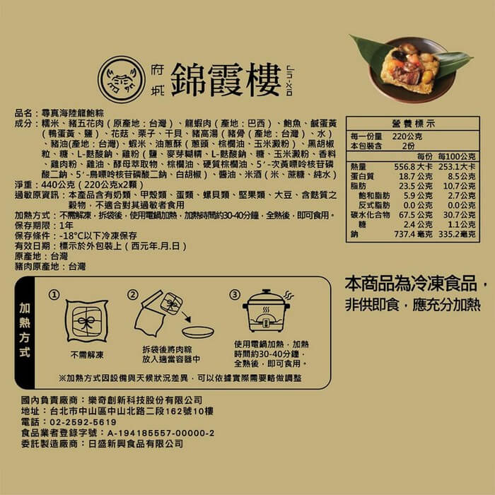 - 主商品尺寸/規格/重量:品名:【錦霞樓】尋真海陸龍鮑粽禮盒(2入)x3盒 內容物名稱:【錦霞樓】尋真海陸龍鮑粽禮盒(2入)x3盒 內容量:440g(海陸龍鮑粽220g*2顆)/盒 x3盒 原產地:台灣 保存期限:冷凍 12個月 製造廠商或國內負責廠商名稱: 樂奇創新科技股份有限公司 製造廠商或國內負責廠商電話:02-2592-5619 製造廠商或國內負責廠商地址: 104027 台北市中山區中山北路二段162號10樓 投保產品責任險字號:明台產物保險:0803-14PDT00874號 食品業者登錄字號:A-194185557-00000-2