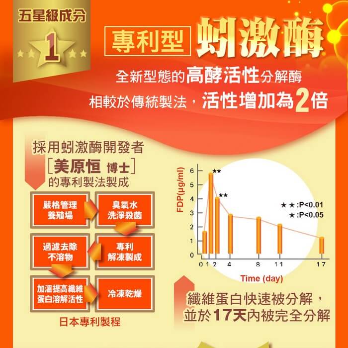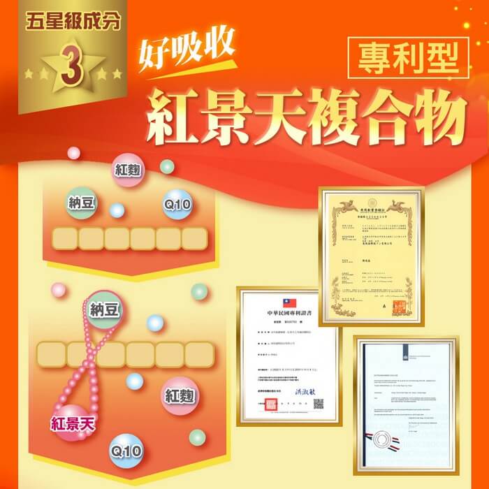 - 材質/食材:成分: 紅麴萃取粉、納豆萃取粉(納豆激酶活性20000FU/g;麥芽糊精、納豆發酵物)、輔酵素Q10、專利TA關鍵傳透複合物【紅景天萃取物(紅景天萃取物、麥芽糊精)、扁實檸檬粉末】、微結晶狀α-纖維素、硬脂酸鎂、紅蚯蚓粉(含蚓激酶)、膠囊(明膠、二氧化鈦、甘油、硫酸月桂酯鈉、食用黃色四號、食用紅色六號、食用黃色五號、食用藍色一號、純水)