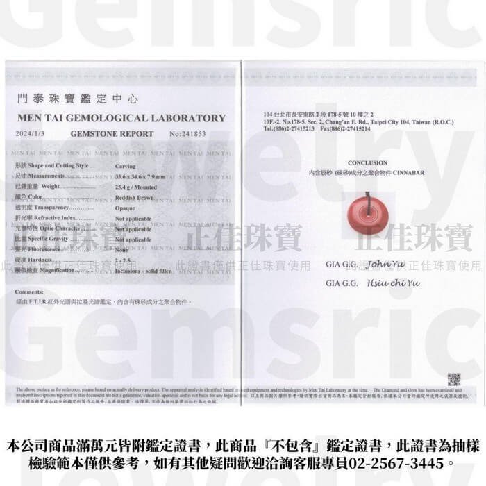 - 主商品尺寸/規格/重量:帝王硃砂 轉運回紋 平安扣 34mm 硃砂吊墜|可調式棉繩 主角:帝王硃砂 轉運回紋 平安扣 34mm 硃砂吊墜|可調式棉繩 尺寸:34x34x7.8mm ± 0.5mm 產地:中國湖南 重量:24g以上 數量:1 顏色:紅色 編號:PCB002 備註:硃砂商品為天然硃砂原礦研磨成粉壓制而成的成品,製作成品過程中均會加入黏著及聚合膠。(特此均有抽樣開立鑑定證書,證明此商品內涵硃砂成分。)